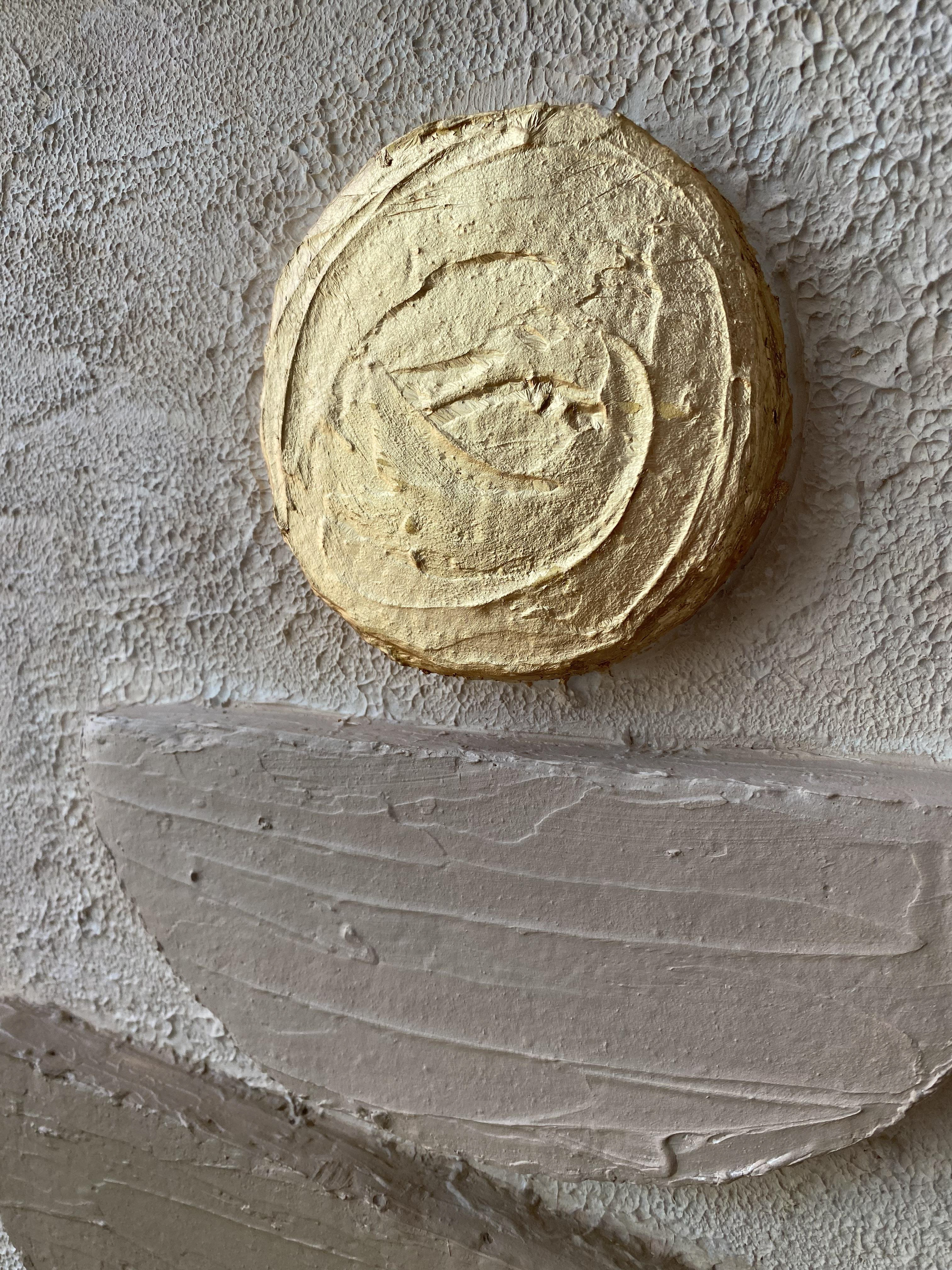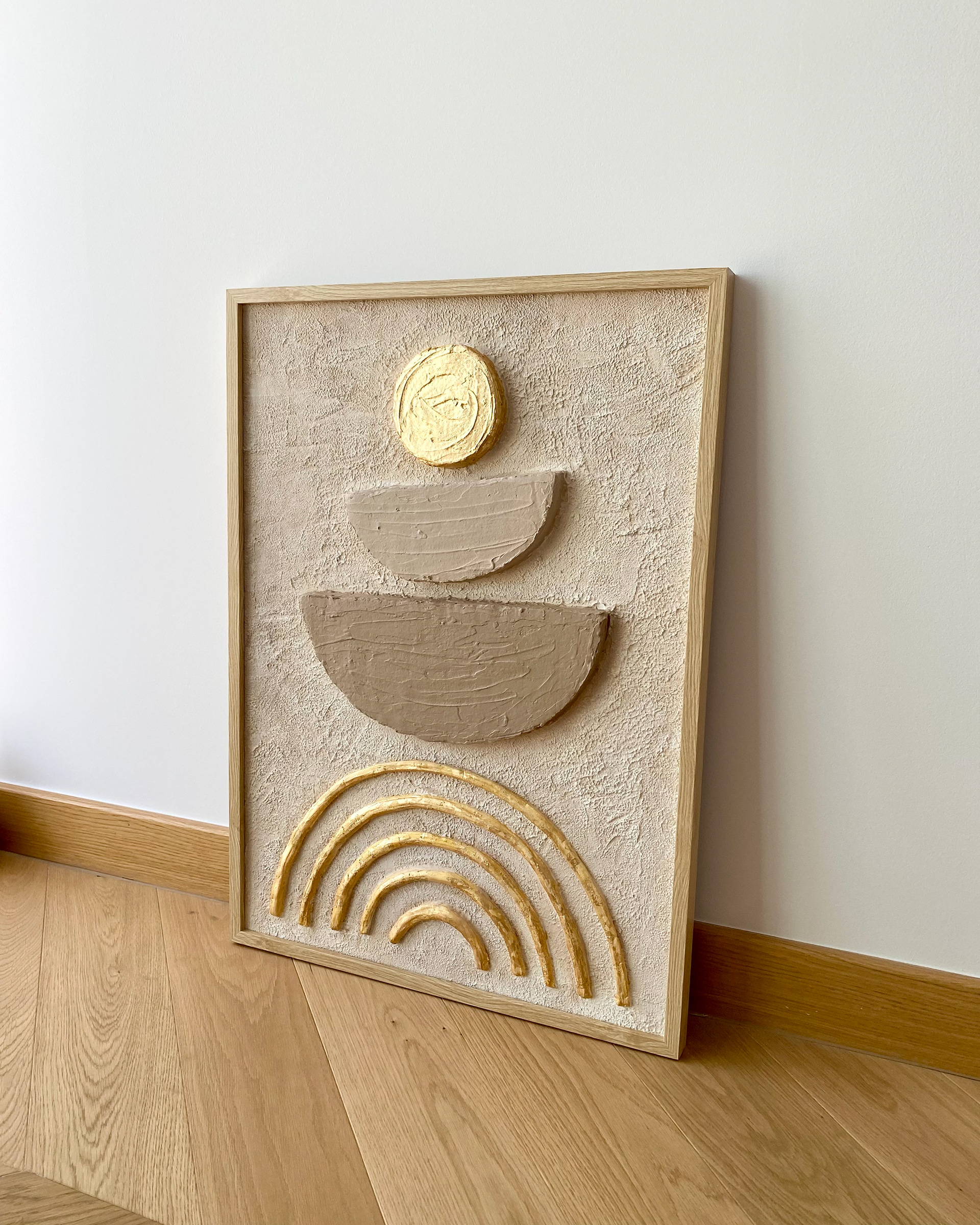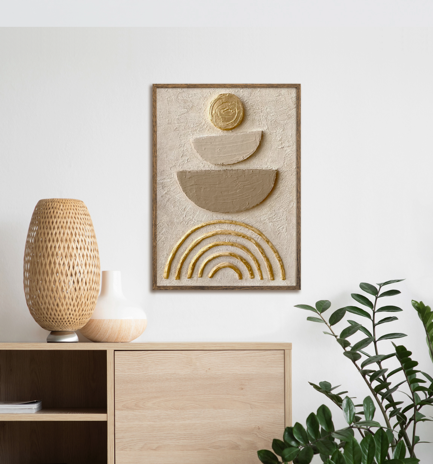 A textured abstract artwork that combines earthy neutrals with golden accents, symbolizing harmony and calm. The layered forms and radiant arcs bring warmth and balance, making it a timeless statement piece for any interior.