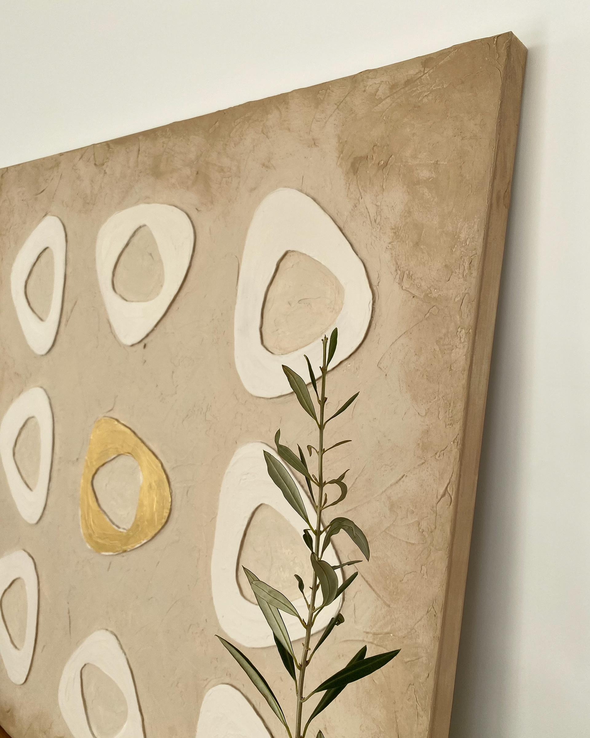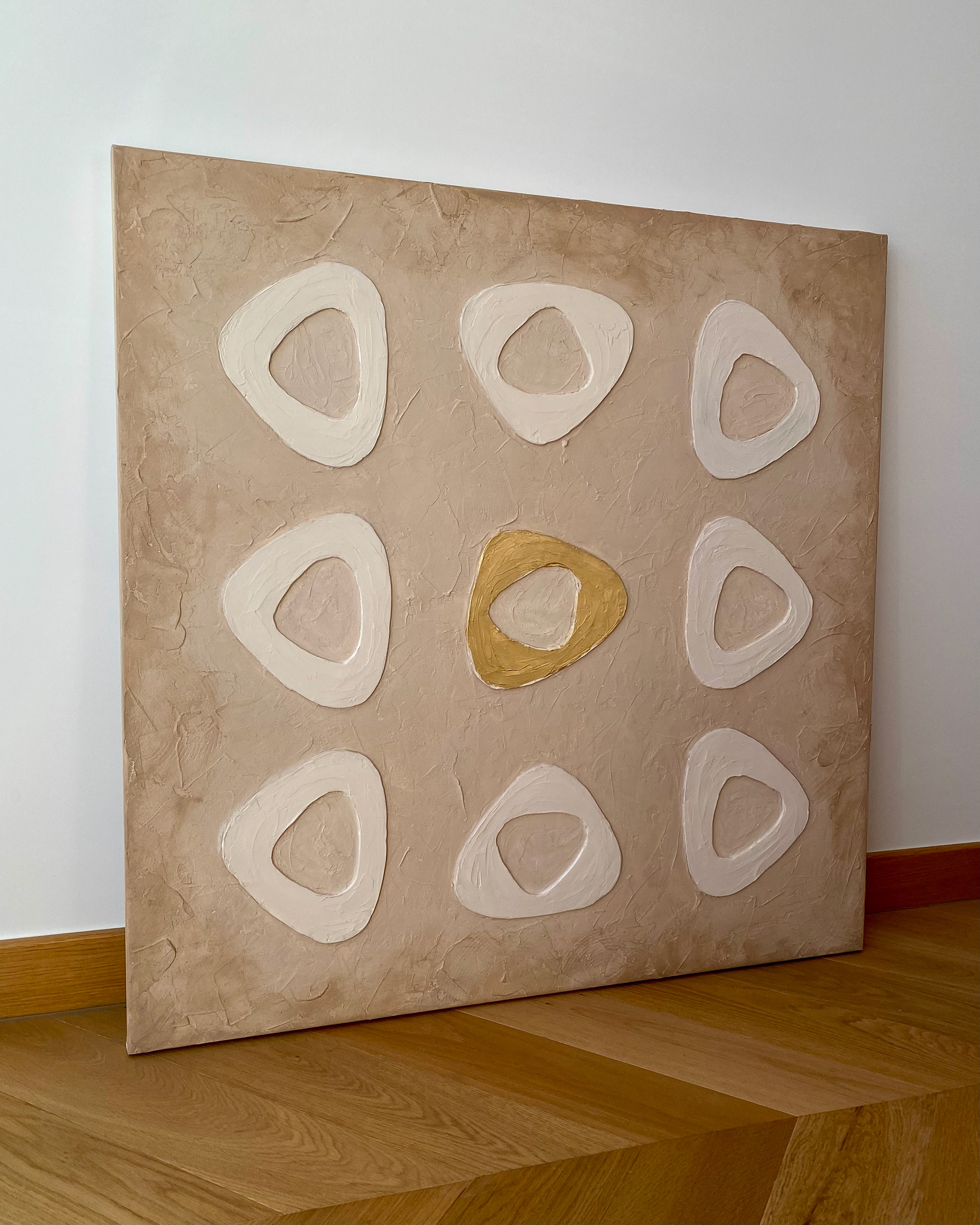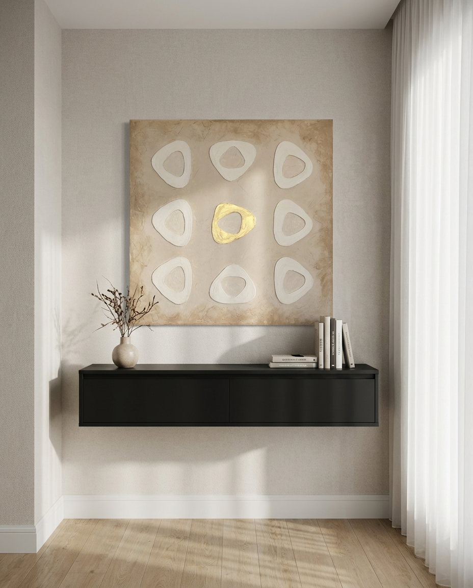 Earthy neutral tones with a subtle gold accent make it a statement artwork without overwhelming the space. Designed for modern, minimalist and warm contemporary interiors.