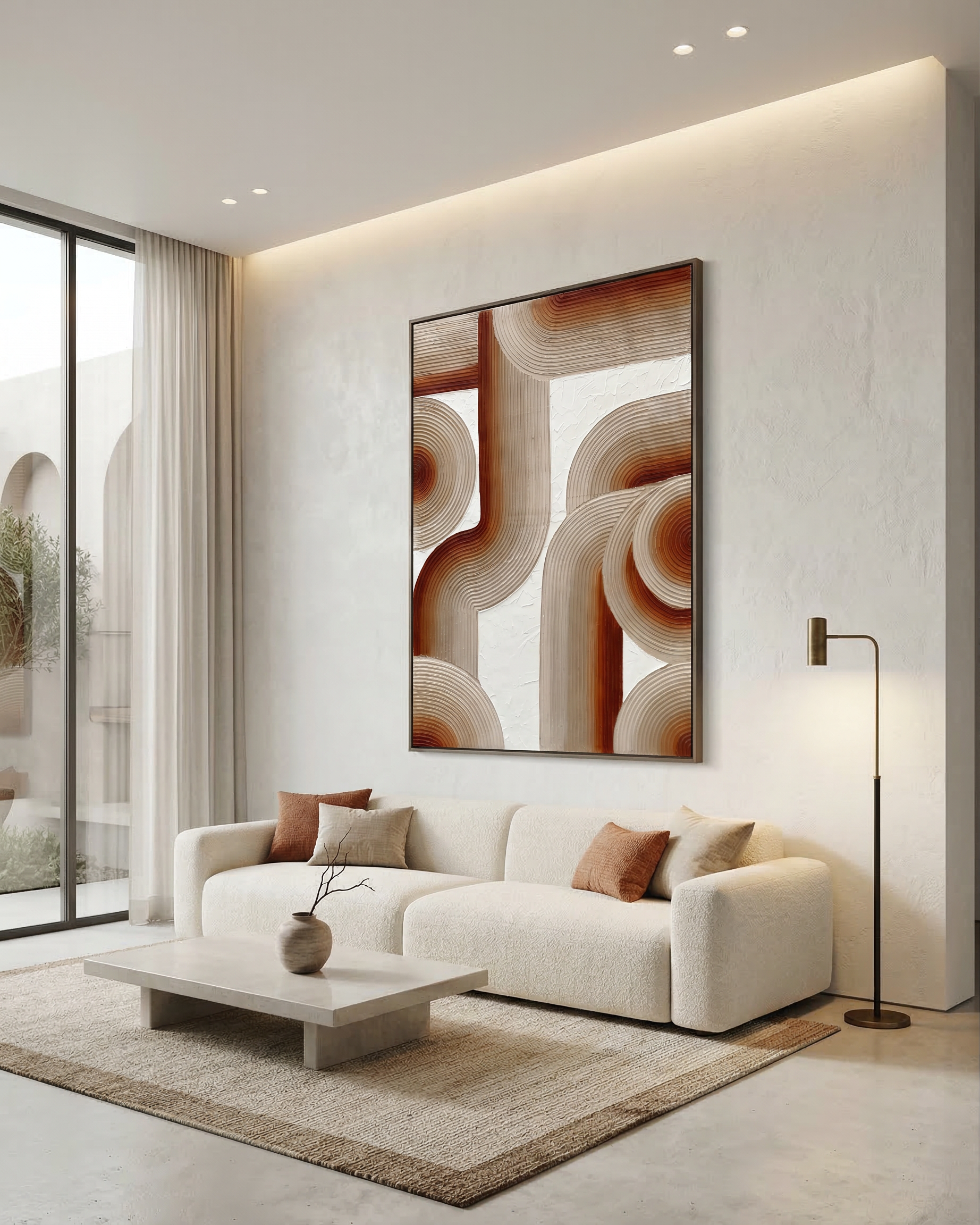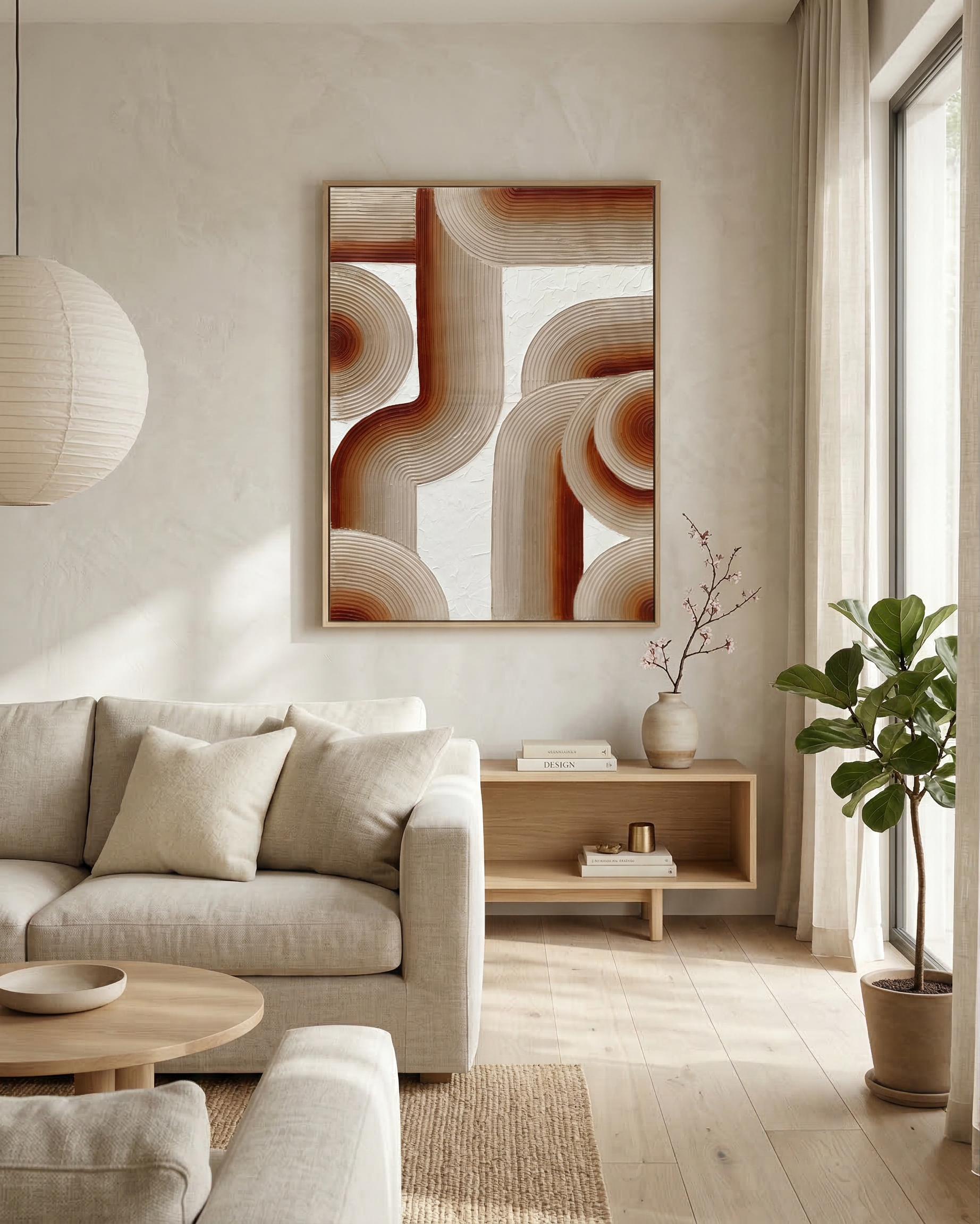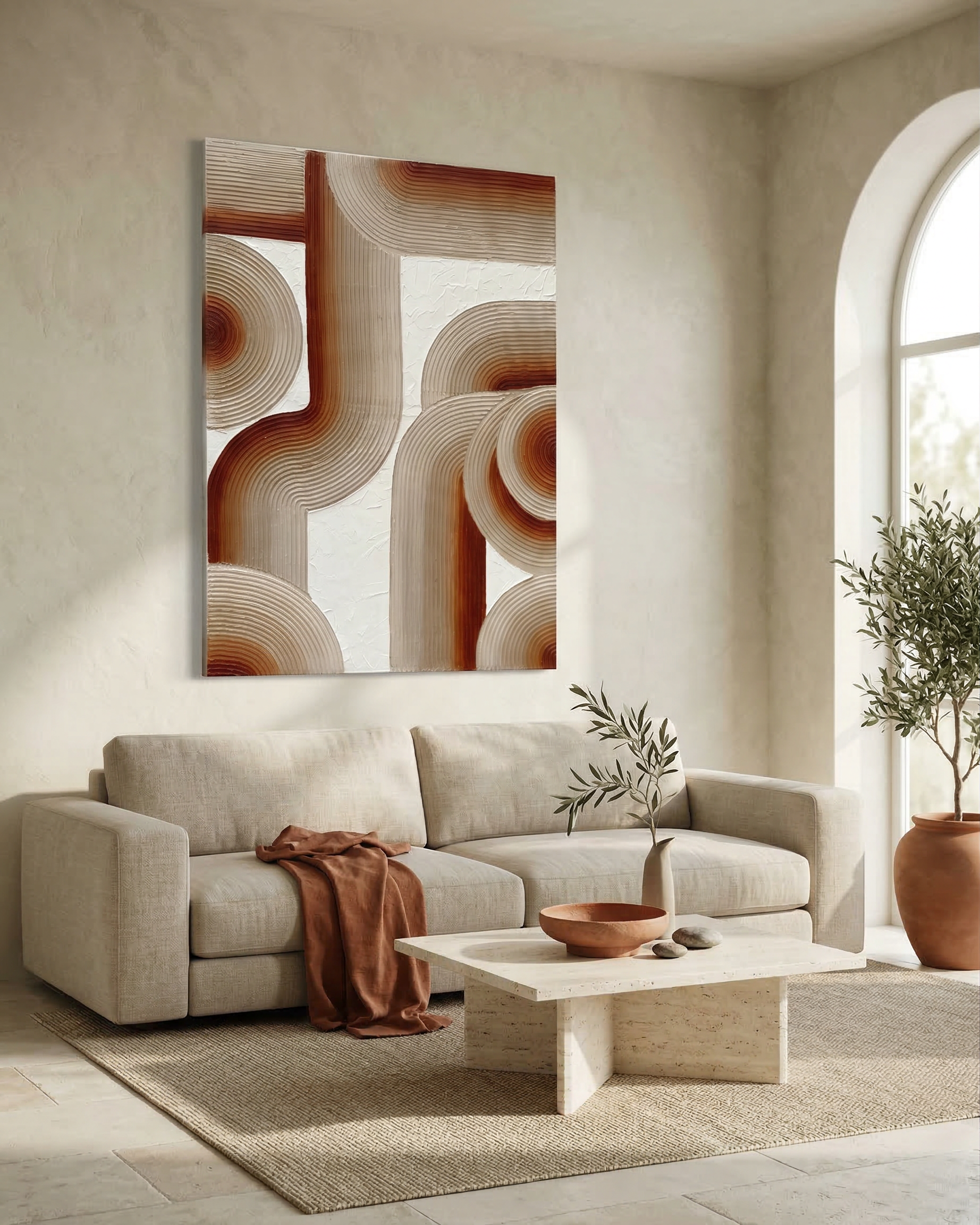 A contemporary textured artwork defined by sculptural lines and flowing forms. Its warm neutral palette and dimensional surface make it a versatile statement piece, designed to complement modern, minimal and earthy interiors.
