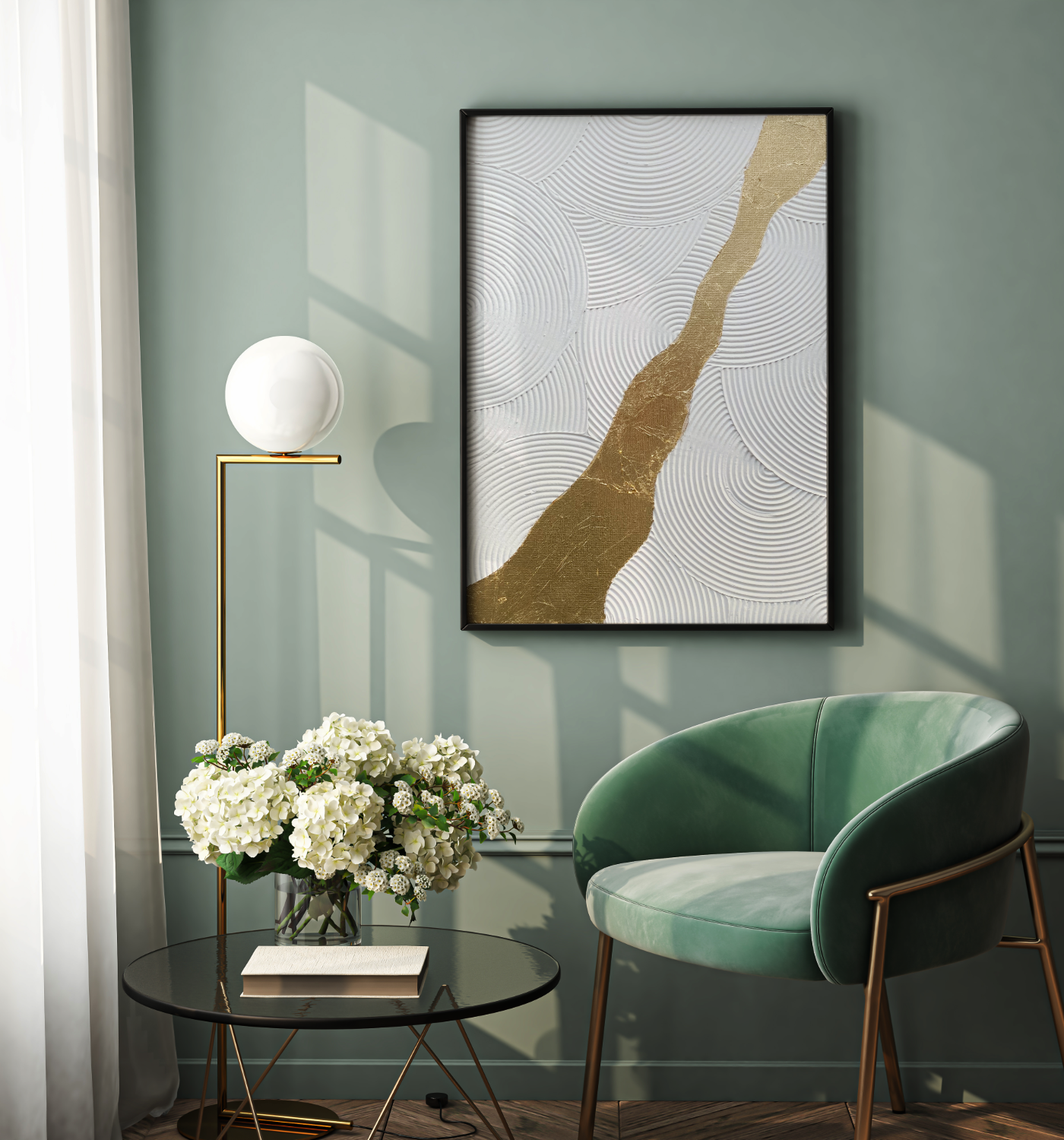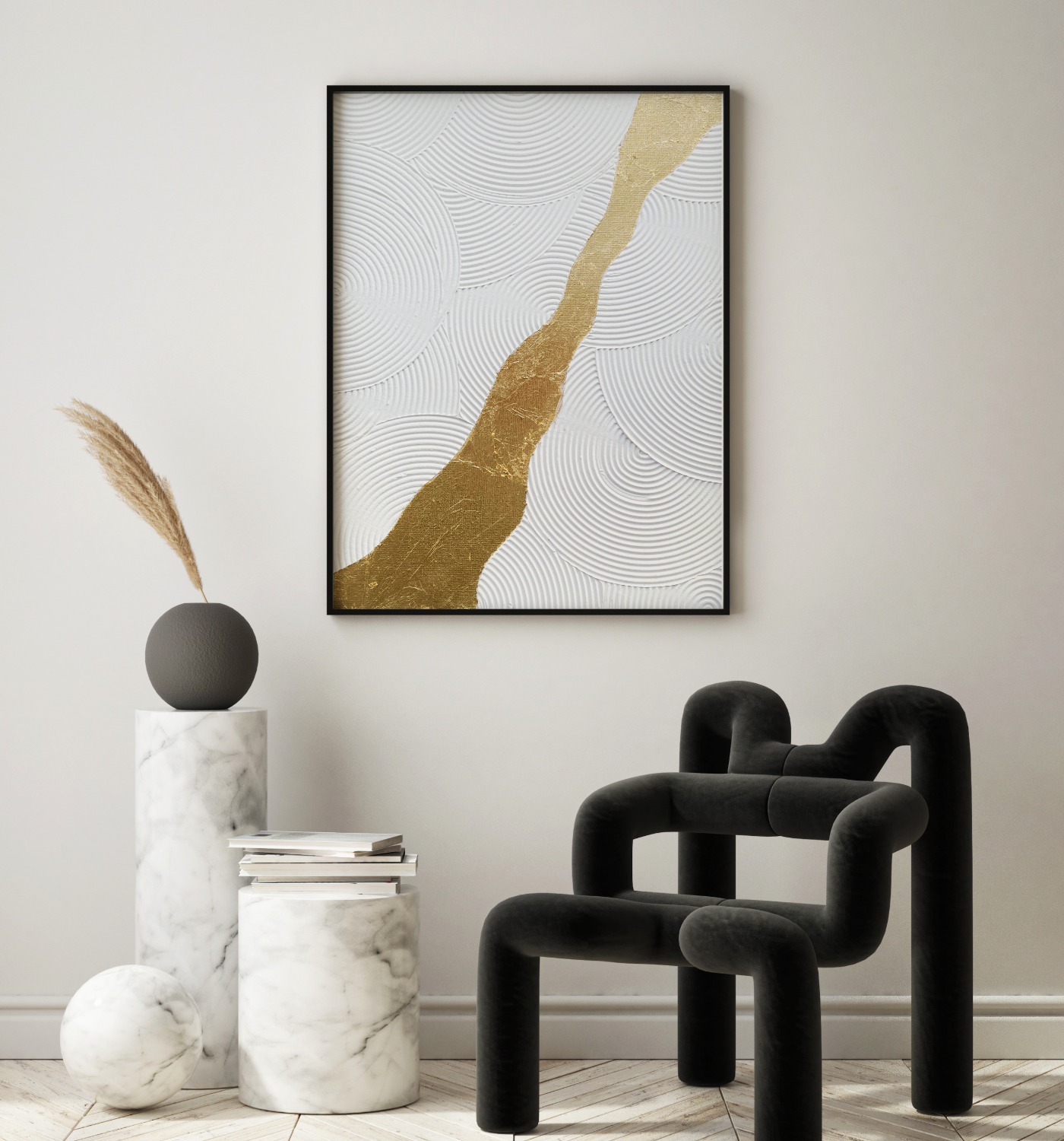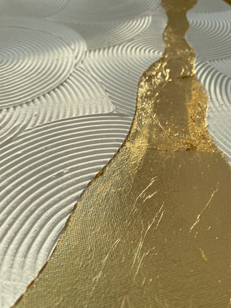 Inspired by natural forms and wabi-sabi philosophy, this artwork celebrates beauty found in contrast—where subtle textures are elevated by a luminous gold path.