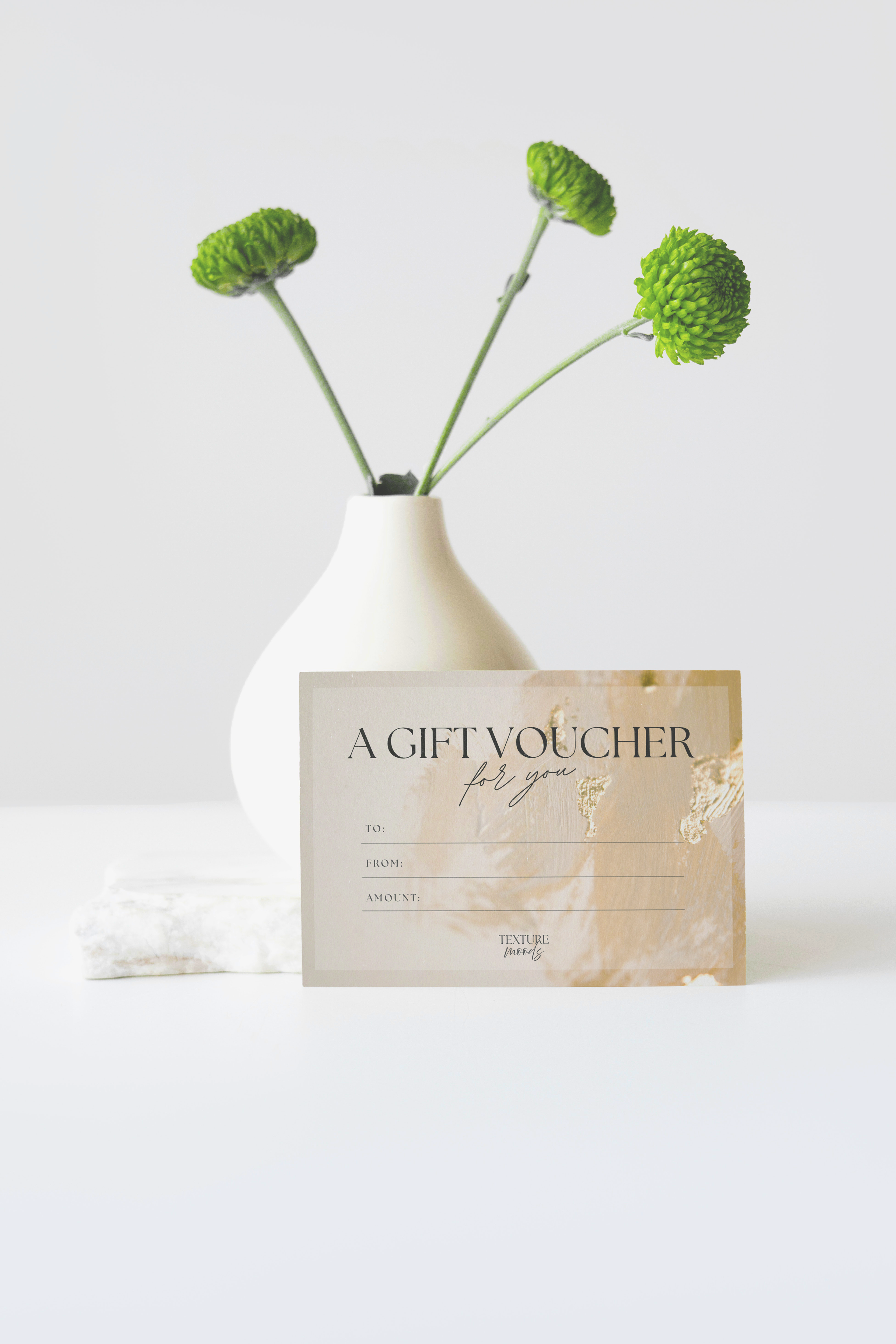 Each Gift Voucher is personalized with the recipient’s name and can be used toward a custom textured artwork of their choice.