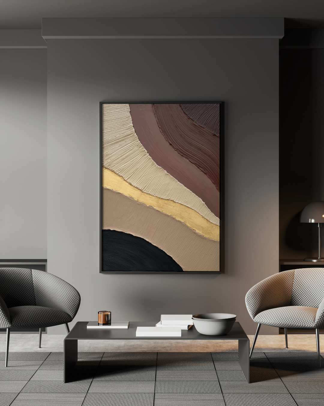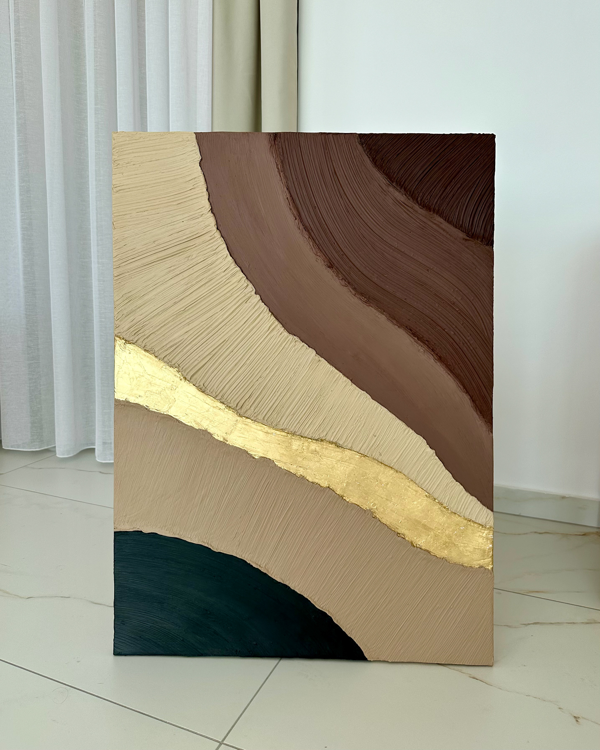Medium: Texture paste, acrylic paint, gold leaf details, varnish on canvas